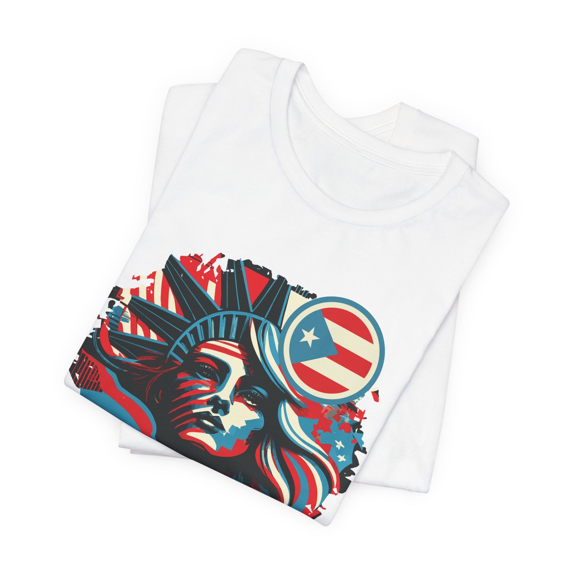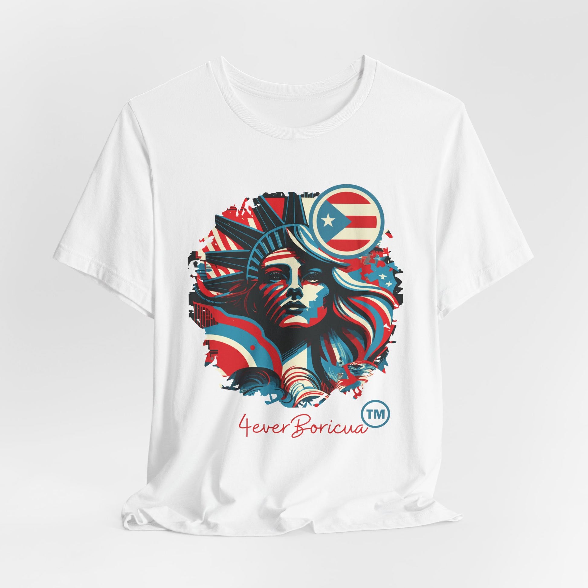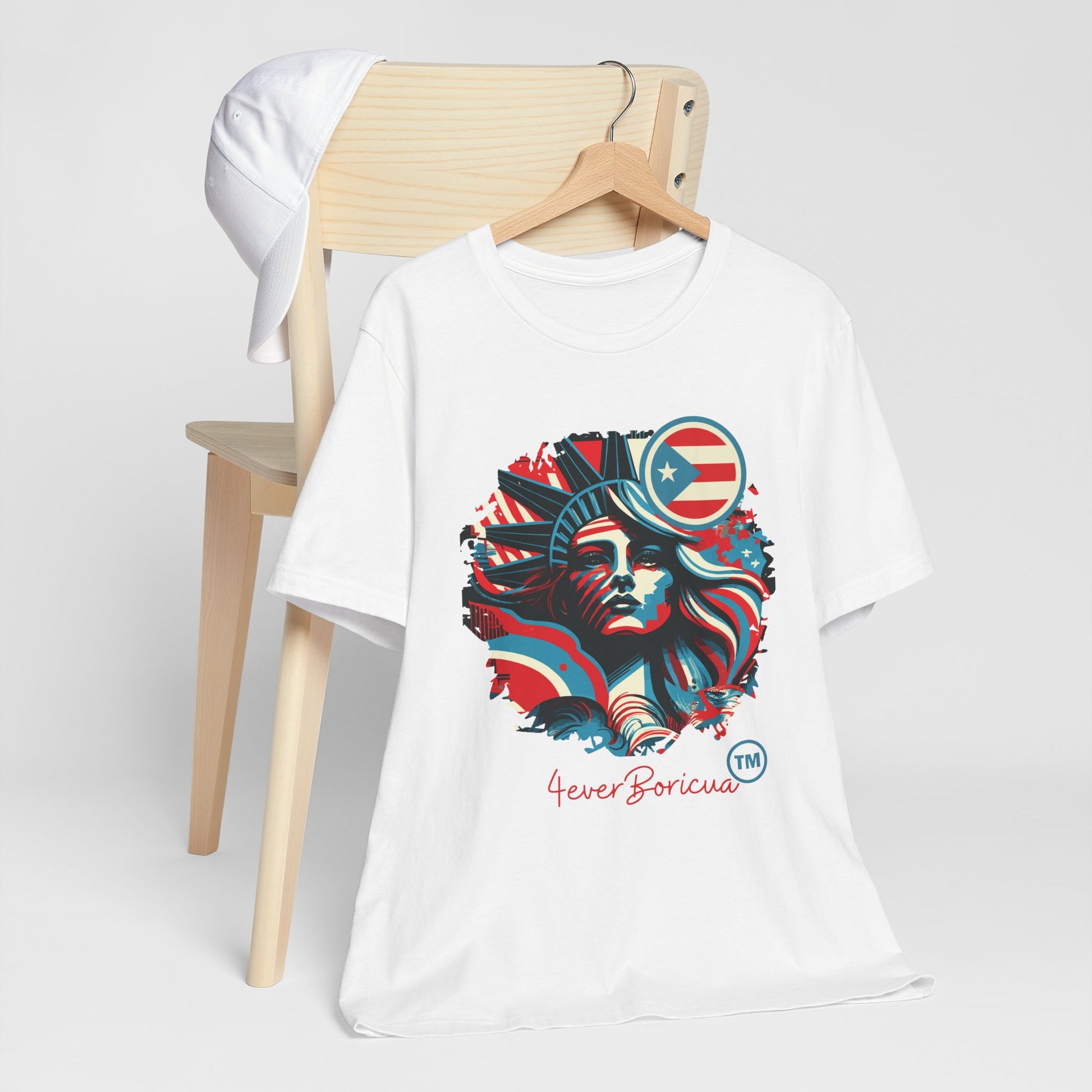 Show your Nuyorican Pride with this beautiful New York - Puerto Rico Diáspora shirt of 4everboricua™️ inspired in the Statue of Liberty and the Puerto Rican Flag. Excellent for personal daily use, events, travel outfits, beautiful pictures and as a perfect gift for Puerto Rican. Color WHITE. Unisex. Sizes from XS to 5XL. Great quality, soft, no ironing. Free Shipping. WWW.4EVERBORICUA.COM